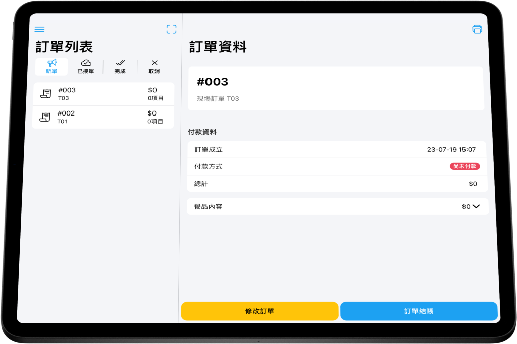 系統具有彈性餐牌的功能,讓您可以隨時增加各種分類、商品及配料,以滿足您不斷變化的需求。